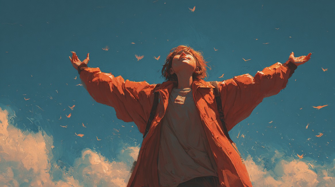 Person in an orange jacket stands with arms raised under a bright blue sky, symbolizing positivity and freedom
